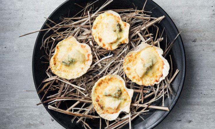 Gratinerad torsk och pilgrimsmussla täckt med vitvinssås och lagrad ost är en snabb, enkel och festlig förrätt. Torsken och pilgrimsmusslan har ungefär samma tillagningstid och passar därför särskilt väl i den här kombinationen.