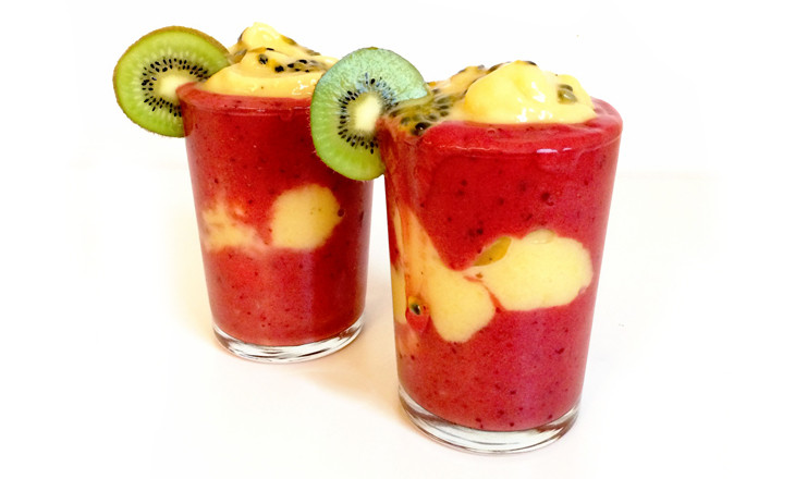 Häll upp smoothien i glas, varva med mangoglassen och toppa med passionsfrukt. Njut!