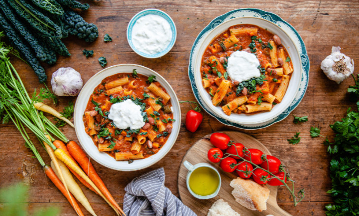 Häll upp 3 dl av tomatsåsen i en mixer tillsammans med hälften av bönorna, mixa helt slätt och lägg tillbaka i grytan. Tillsätt pasta och när pastan har cirka 5 minuter kvar tillsätt resten av bönorna samt kål och persilja. Låt allt koka tills pastan är färdig. Smaka av med citron, salt och peppar.